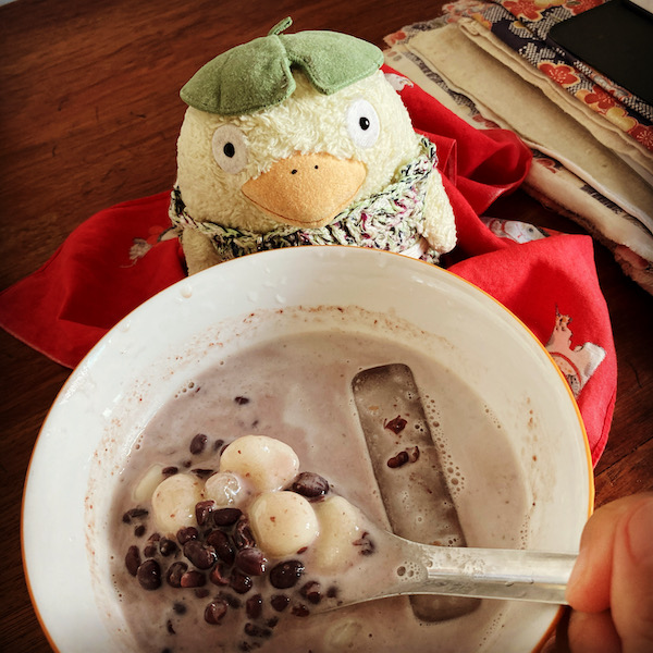 8時から母とzoomでラジオ体操して、白玉を茹で、昨日の残りのアズキミルクに入れて食べました。