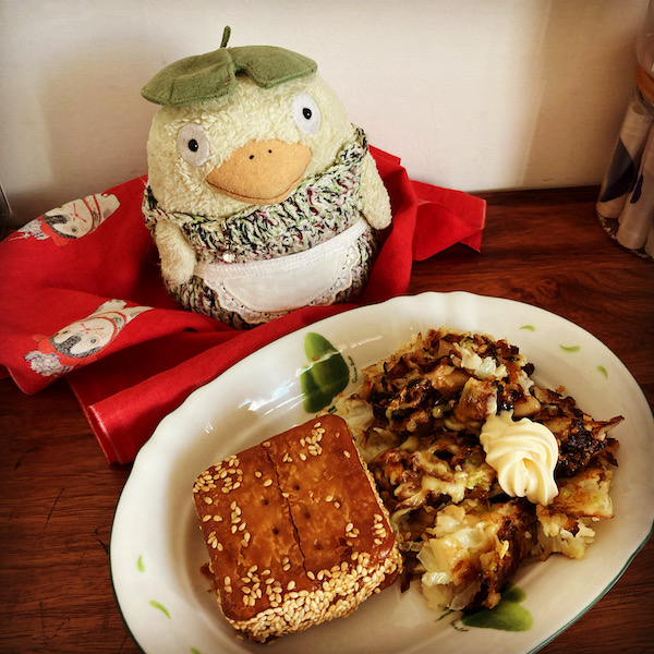 帰宅して冷凍庫のお好み焼きと芋頭餅を解凍して焼いて食べました。