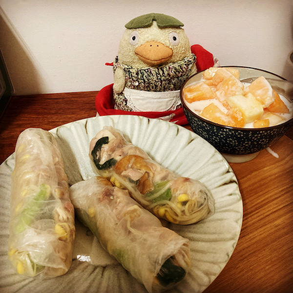 それらをさっと茹でて、鶏肉と一緒にライスペーパーで巻きました。