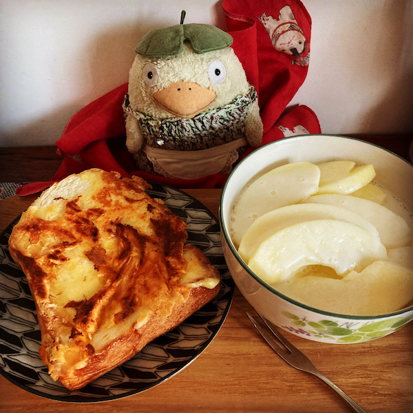 朝ご飯にチーズトーストと、リンゴに飲むヨーグルトかけたやついただきました。