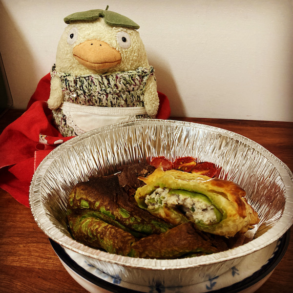 ソース作って、クレープ焼いて、牛肉も焼いて、鶏肉のミンチ的なものも作り、クレープ生地に鶏肉ミンチをしいて、切った牛肉を乗せて巻いて、それをさらにパイ生地で包んで焼いて、盛り付けにソースをかけるって感じだったが、工程が多すぎて、ミキサー待ちとかもあって、気づけばもう17時。付け合わせやソースはいいや、ってことになりました。笑