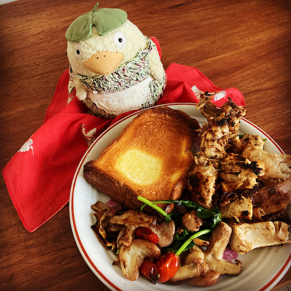 冷凍してた実習のローストチキンを焼きつつ、昨日の実習の残りのあれこれを焼き焼きしてトーストも焼いて、作成しました。