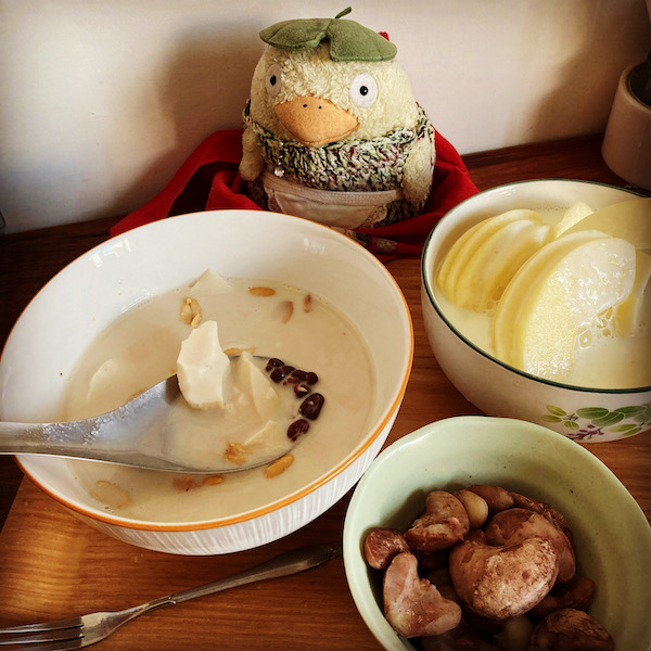 ちょっとお腹空いて来たので、飲むヨーグルトかけたりんごと、豆乳をかけた豆花を食べました。