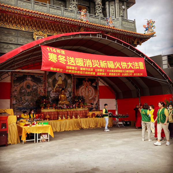 廟のすぐ横にある建物内で、今日の流れについて説明してる人がいて、中で座って一緒に聞く。たまに台湾語になったりして分からん箇所もありつつ。低所得者の方に生活用品を配る!というのがあって、それの説明とか。