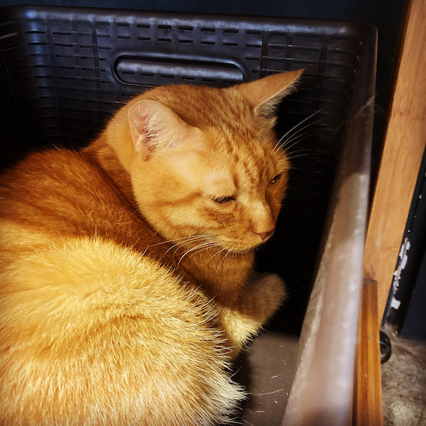 お客さんが荷物入れるカゴに入っちゃってる猫ちゃん。