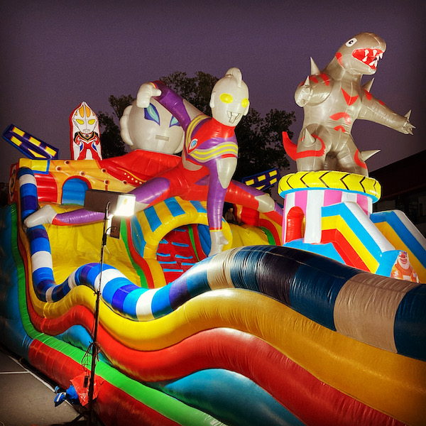 廟の中を見終わって、テント出店のエリアを見に行く〜。子供が遊べるエリアもあって、それがなんかユルい・・・パチモン感のあるウルトラマンと怪獣・・・。
