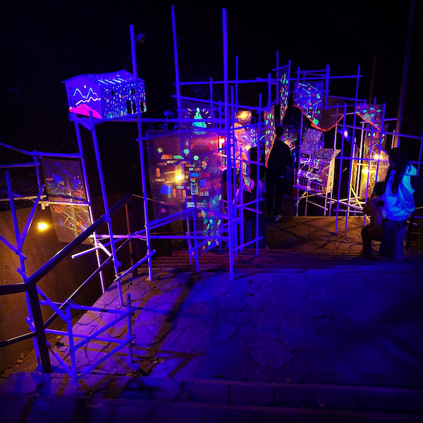 映像みたいなのとか、ブラックライトで光る作品とか、廃材を利用した作品とか、いろいろあって面白かったです。木の中に点々とホタルがいるみたいなライトがあって、それがとても綺麗だった〜。あと山の中をランタン持った人が歩くので、闇の中にランタンの光がぽつぽつっと見えて綺麗だった!観覧者もライトアップ作品のひとつとなる!