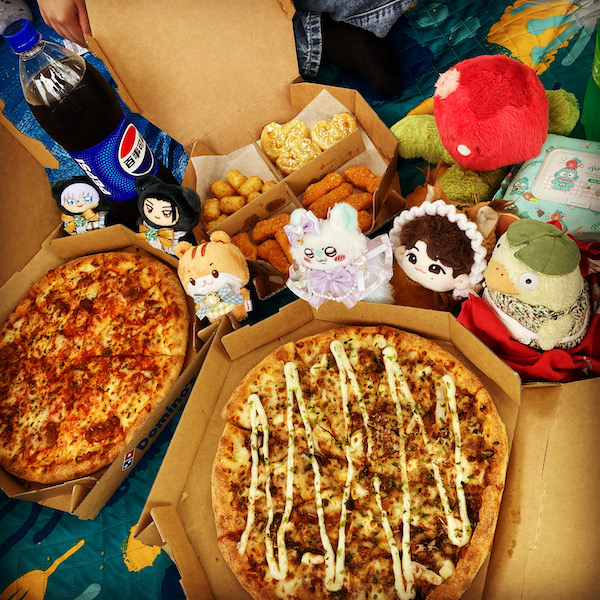 ピザを並べて撮影会。トリさまも混ぜてもらう。