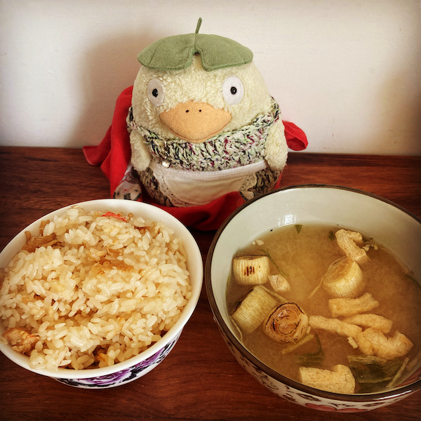 炊き込みご飯が炊けたので、インスタント味噌汁と共にいただく、