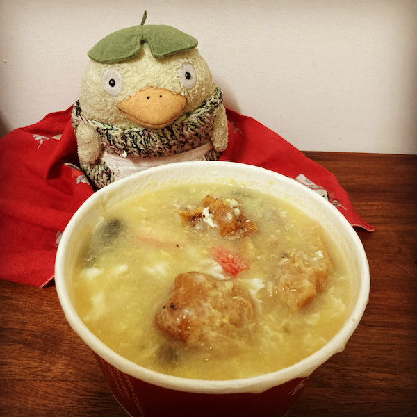 帰りにベジタリアン自助餐でおかず買って帰ろう〜!と向かってたんだけど、久々に廣東粥食べたいな!と思って手前のお粥屋さんへ。初めて買った時は75元くらいだったのが、今や110元!めちゃくそ値上がりしとる!でも久々に食べたいので買って帰る。