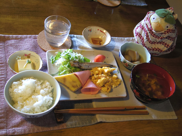 ![]() ハムとタマゴ、サラダ、ししゃも、お吸い物、煮物、卵豆腐、漬けもの。和食! |