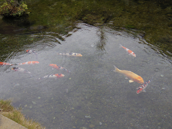 先客のカップルさんが、えんがわに座って鯉にエサをあげてました。