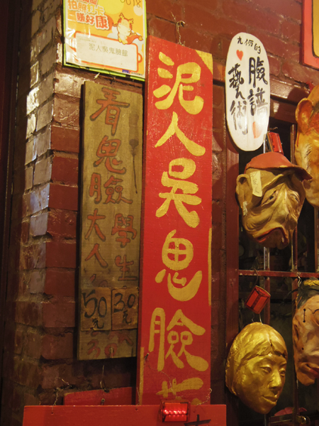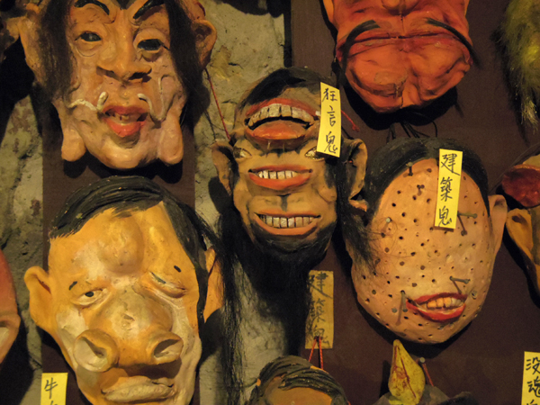 階段になってるところのお店を見ていたら、変なお面が並んでるところが・・・