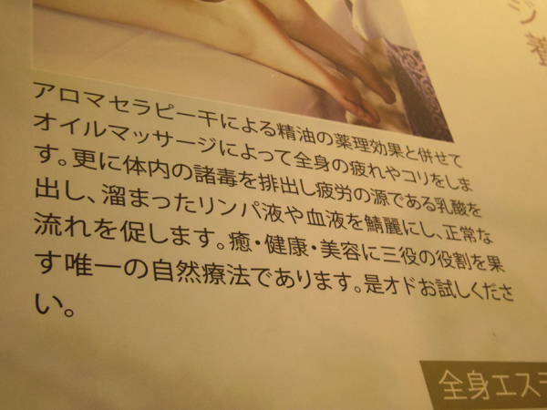 | 「アロマセラピー干」とか「全身の疲れやコリをします」は、まあ普通だけど、最後の「是オドお試しください」ってのが・・・!! 「非」→「オド」・・・うん、まあ、似てるか。 |