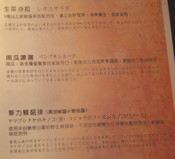| レタスサラダ 5種以上の活きのよい?菜はやはり組み合わせてそれで成功して、 酒上の少しはナッツを許して、清夷に養生して、健康的に満タンは点を打ちます。 パンプキンスープ 多種の栄養素がそのうえ美味であり口に合っていることを含んで、 カボチャの泥になって壊れることに味付けを煮ることを煮て、 酒上は丁をつかさどることを吐いて、濃いアルコールは口に合っていて甘美であり密です。 ヤマブシタケのキノコ 藤枝山地の野生ヤマブシタケキノコから来ることを使用して、 キノコの療の育成ヤマブシタケキノコに成長することを起こすことと比べて、 多かっの1種の鳥獣の肉と口当たりは、 防腐剤と香が作成することを添えなくて、生鮮は美味であり食べたものは到達する。 もう最高すぎる、このメニュー!!!!!!! |