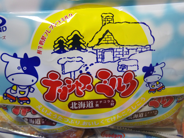 | 「テリシャスミルク」という商品。 日本の「雪の宿」みたいな、白いクリームがかかったせんべい。 なぜか「北海道」アピール。 「ナチコラル素材」→「ナチュラル素材」 なんかいろいろとツッコミどころのあるパッケージだったので、ジャケ買いしました。 |