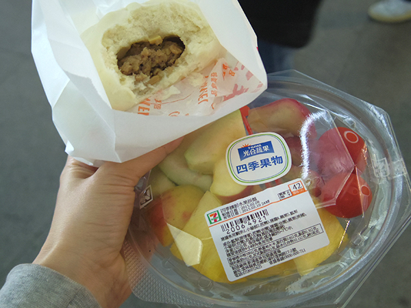 本日の午後はローカル線の旅ですので、何か食べよう~と思って駅構内のセブンイレブンでお買い物。私は肉まん(タケノコ入り)と、フルーツ盛り合わせを買ってみました。これを食べつつ、切符を買って電車に乗り込み~。