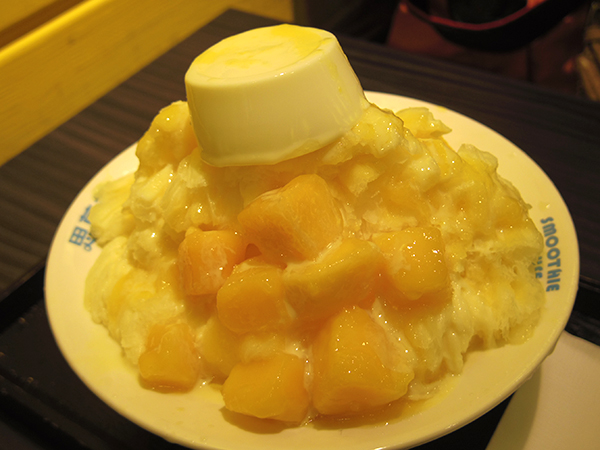 結構おなか具合は満足したので、シメにデザートを!過去二回の台湾旅行で食べ逃している「マンゴーカキ氷」を食べよう!ということに(メッチャ寒いけど)。さっき鶏肉買うときに並んでて見かけたお店に行ってみることに。当店でいちばん人気!みたいなマークがついている、マンゴーカキ氷にマンゴー果肉&手作りパンナコッタが乗っているやつをオーダー。