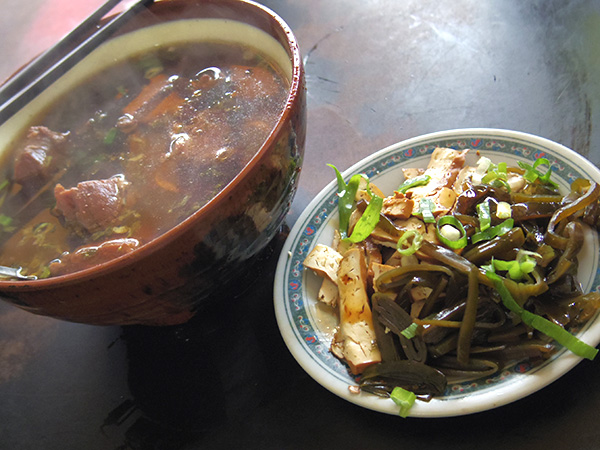 ![]() 牛肉麺(100元)と、豆干&昆布(それぞれ15元)。 |
