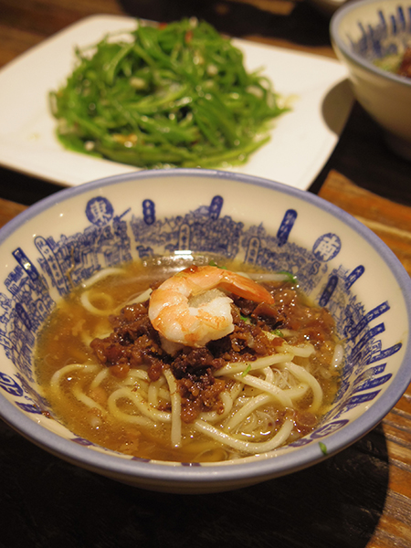 ![]() タンツー麺。奥にあるのは水蓮菜の炒め物。 |