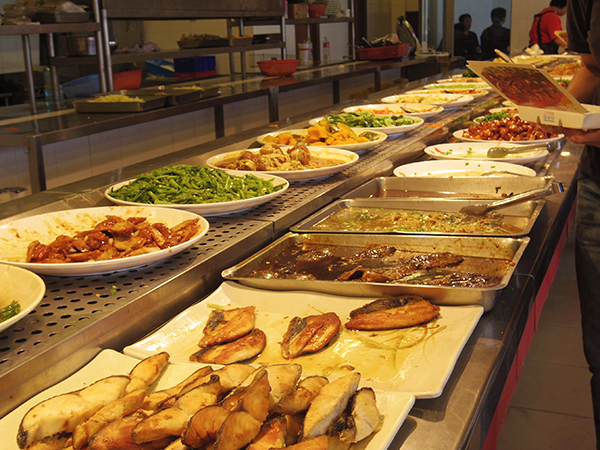 少し休憩したところで、おなかも空いてきたので出発!駅からここに来る途中に見えた、小港自助餐へ。「自助餐」っていうのが、チャレンジしてみたいと思っていた“バイキング形式でおかずを取るスタイル”の食堂。行ってみたら、結構にぎわっていました~。もちろん観光客なんて居ない!地元の人オンリー!