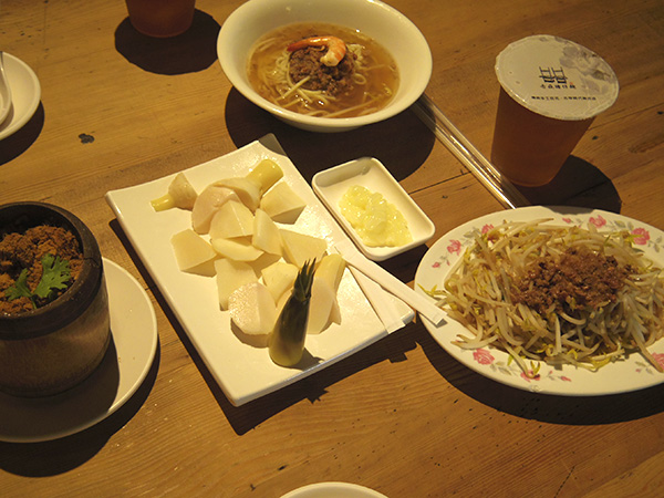 13時頃にはむ家に戻りました。高橋さんも仕事を終え、そろそろ出られるということだったので、一緒にランチへー!と向かったお店が定休日だったようで・・・閉まってたからお店をスルーして通り過ぎちゃってて、あれ?こんなに歩かないはず・・・と戻ったら閉まってた!という。。残念。別のお店に行くことにしました。ちょっとおしゃれな感じの色んなお料理が食べられるお店。ちまき、タケノコサラダ、タンツー麺、もやし炒め、冬瓜茶を頼みました。美味しかった!冬瓜茶って何かの味に似てるー。この味知ってるー。黒糖っぽいというか・・・。