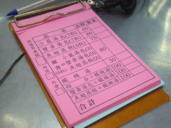 何食べよーかなーと迷ってたら、小籠包のお店の人が声かけてくれたので、そのお店に決定。一人で小籠包ってちょっと多いな~それだけでお腹いっぱいになっちゃうな~って思うのですが、このお店の小籠包は蟹2粒、魚2粒、普通の3粒が盛り合わされているのです!これいい!それと、酸辣湯のセットがあったので、そのセットにしました!セットで100元。
