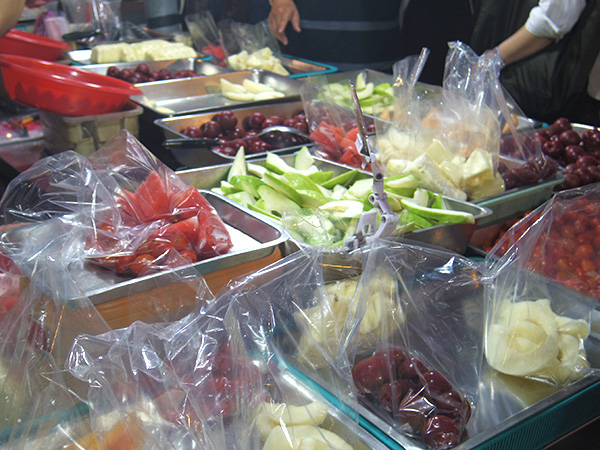 後は何かデザートかな~って見てたら、果物屋さんがあったので、スイカをリベンジしようかと!新鮮なスイカー!カットされて袋に入ったのがあったので、それを指差し「多少銭(ドゥオサオチェン)?」て聞いたら「ウースー」と。まだ数字の聞き取りがパッとできないんだけど、手で5ってしてくれたので、50元だ!とわかって、支払い、購入。夜市沿いの道路のとこに座るところがあったので、早速食べました!めちゃ甘!うまーい!とっても美味しいスイカが食べられて満足ー!