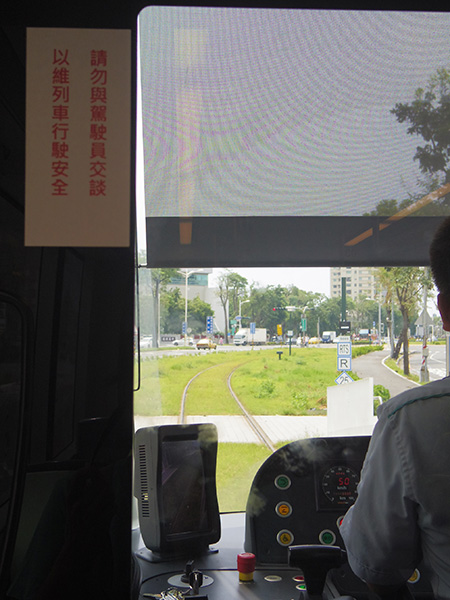 まずは、昨日教えてもらった『ライトレール』という乗り物に乗りに行くことに。現在、高雄には十字型に地下鉄の路線が走っているのですが、このライトレールは山手線みたいに町中をグルっと回る計画で線路を作っているみたいです。地下鉄に乗って凱旋駅へ。ライトレールの乗り場方面の出口を出て、見渡したら駅があったー!試運転中だから無料と聞いたので、そのまま乗りました。ボタンを押すと扉が開く方式の、道路を走る電車。でも上の電線が無いのです。近未来の乗り物って良くSFとかでチューブの中をシューンと行き来する乗り物とかあって、そういうのが未来に登場するのかな~と思ったけど、路面電車が新しく走るってなんか面白いな~。赤信号で止まるんだよ~。バスみたい。でも電車。
