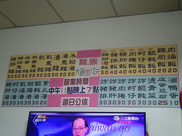 もうそろそろ引き返すか・・・と引き返しまして、途中で見つけた地元の人向けっぽいご飯やさんに入りました。指差しメニューがなくて、お店の壁の高いところにあるメニューをジャンプして指差し!してたら、お店の人がお玉持ってきて「これ?」って感じで。昔、台北でもこうやってお玉で注文したことあったな~(笑)