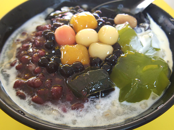 メニューを見ると仙草、杏仁、抹茶、プリンの中から2つ選ぶと書いてあるようだが、何も聞かれず仙草ゼリーと抹茶ゼリーでした。トッピングも写真と違う~。芋の団子が少ない~でもその分白玉が多いのか。ゼリーはつるんと、トッピングはモチモチで、美味しかったです!腹一杯だ!