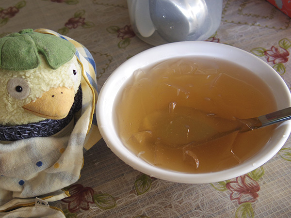 スタート地点まで戻ってきました。そこに飲み物やさんとか数店お店があったんだけど、その中の一つ、愛玉の文字に心惹かれた!バーミヤンのデザートに愛玉子(オーギョーチ)ってのがありますが、あれです。「愛玉」でアイユィって読むはず。それを指差し「アイユィ?」って聞いたら、中で食べる?って感じで聞かれて、はい!と。「レモンかけていい?」と聞かれ、OK!愛玉自体は味のないゼリーなので、レモンシロップなどがかかっているのがポピュラー。テーブルまで持ってきてくれて、塩をかけても美味しいよ!と塩の小瓶も一緒に。