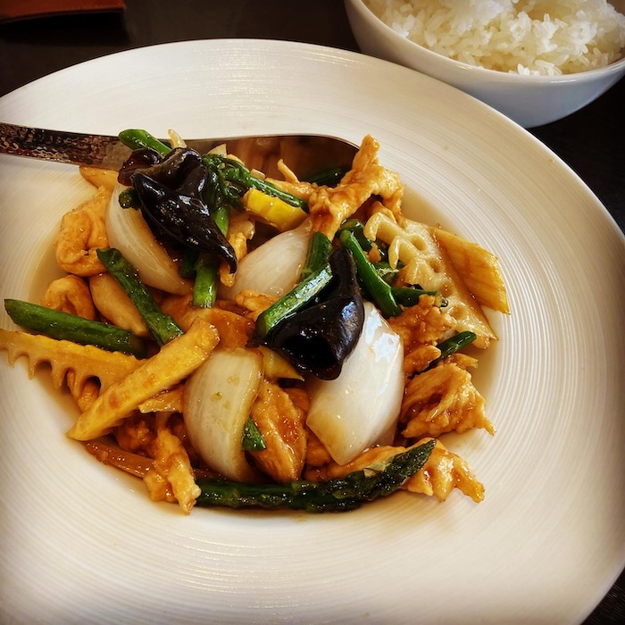 ランチはボードに書いてあるメニューしか無いとのこと。サンラータン、五目そばラーメンごはん、くずし麻婆豆腐、タケノコとアスパラと鶏肉のオイスターソース炒めがあって、各自で注文。私はライスだけを頼んで、皆さんのおかず少しずつもらう〜