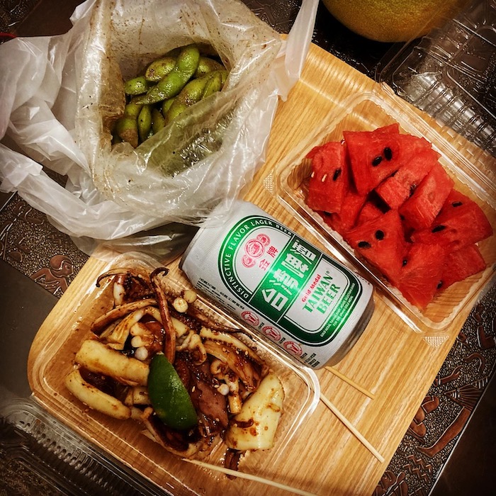 夜市で買ってきたものを並べ、晩御飯。