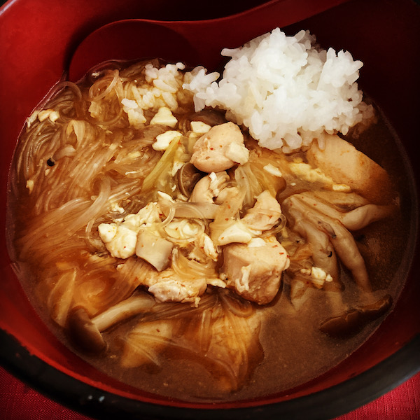 一昨日のチゲ鍋みたいなやつにご飯と春雨入れたやつ!