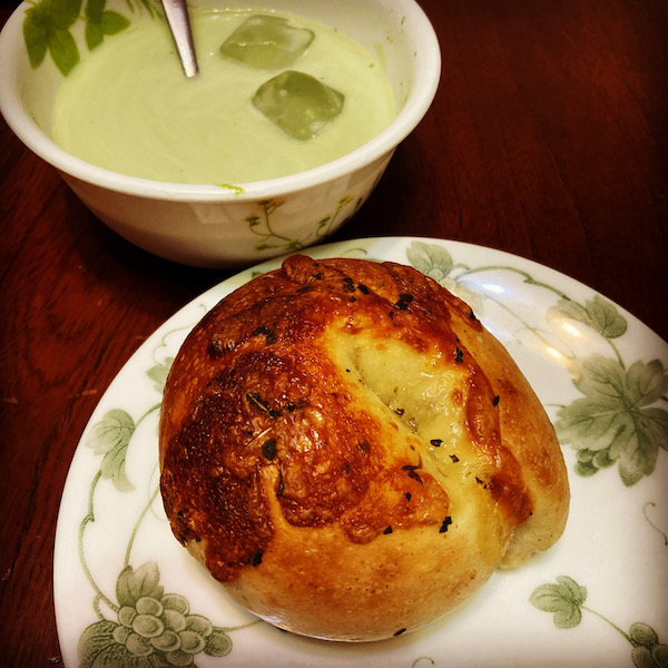 バジルチーズベーグル。飲み物は抹茶ミルク。
