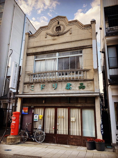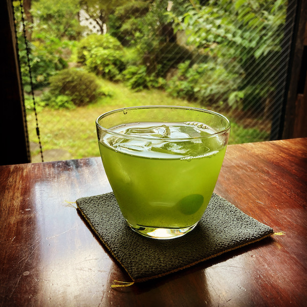 蔵を改装したカフェで冷たい緑茶を飲みました。