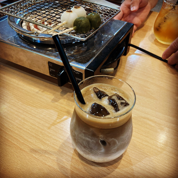 ほうじ茶オレ&自分で焼いて食べるお団子。