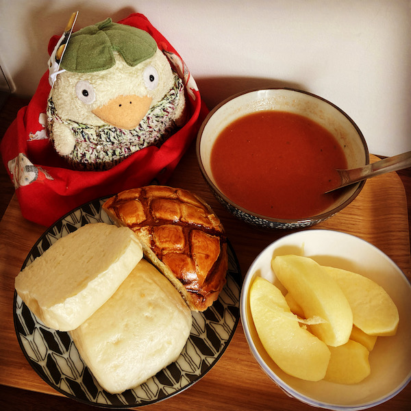 いただいたメロンパン的なやつの残り半分と、いただいた手作りマントウを解凍してトースターで焼き、トマトのカップスープと、冷蔵庫のりんごを1個いただく。
