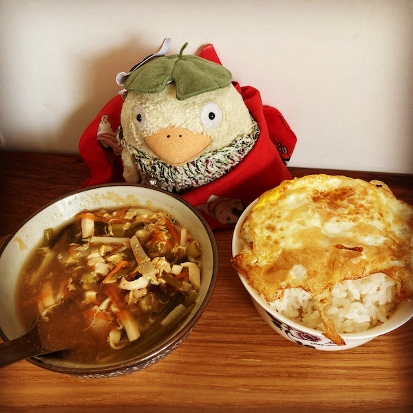 目玉焼きを焼いて、サンラータンを鍋で温める。