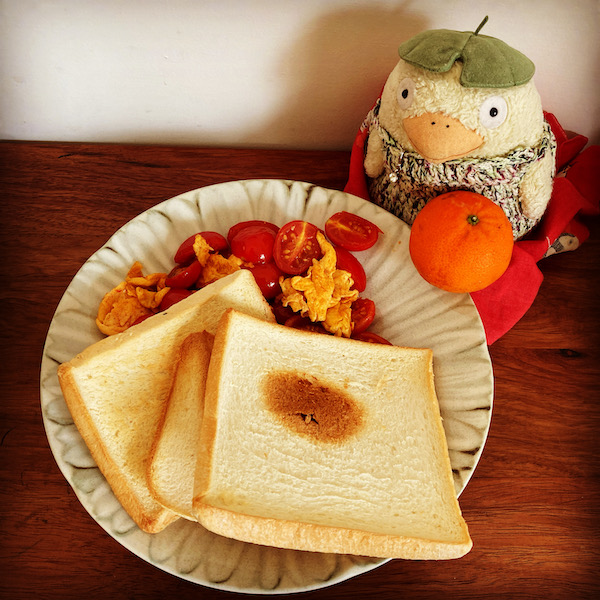 冷蔵庫にプチトマトがいっぱいあったので、それと卵を炒めまして、あとはパンの端っこをトースターで焼きました。