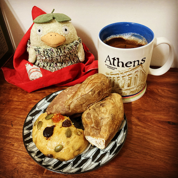 帰宅して昼の残りの蒸しパンと、いま買った焼き芋と、