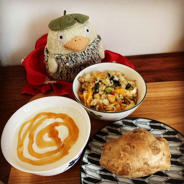 先にシャワーして、緑茶飲んで、母とzoomでラジオ体操して、お昼ご飯に持って行くチャーハンを作成し、それの残りと、ヨーグルトと、昨日の残りの焼き芋を食べる。