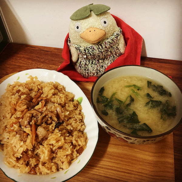 おこわだけだと寂しいので、インスタント味噌汁もつけました。