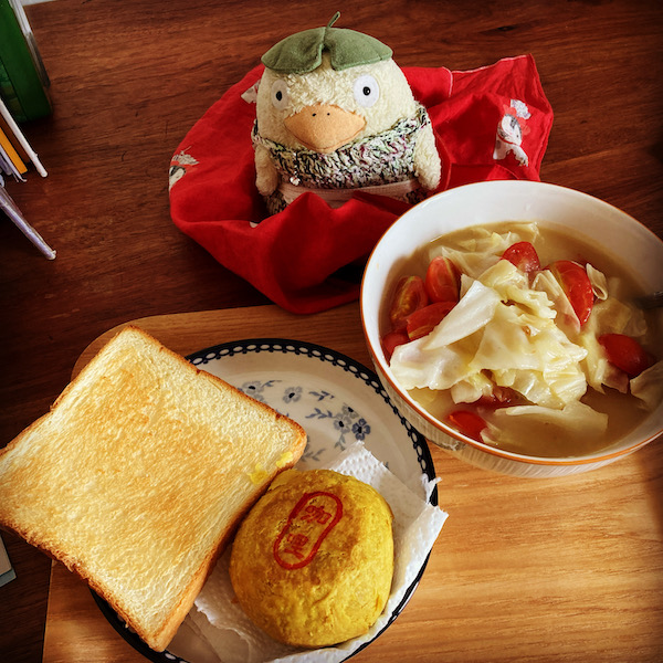 鶏スープにキャベツとプチトマト入れたやつ作って、カレー味のお菓子と、トーストを焼く。