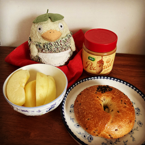 ゴマ入りのベーグルと書いてあったので、ピーナツバターを塗って食べよう!と並べて写真撮ったのだが、ベーグルの中にぐるりとごまあんが入ってた!クリームチーズが入ってるベーグルは食べたことあるけど、ごまあんが入ってるのは初めて!美味しい!