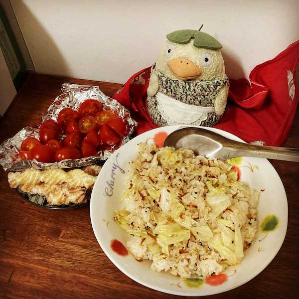 TVerを見てましたが、少しお腹空いて来たので19時半ぐらいに晩御飯作り。冷凍しておいたご飯と、まだ残ってたキャベツと、ちりめんじゃこふりかけでチャーハンを作成し、焼きプチトマトと共に食べました。