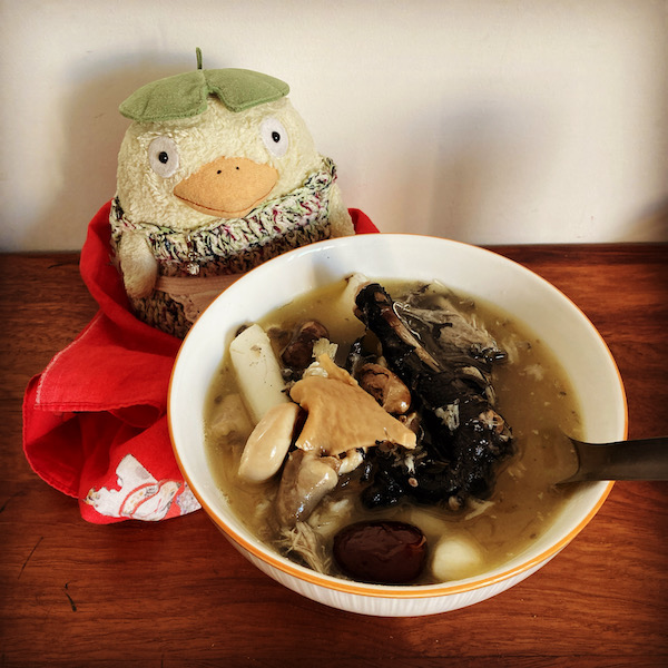 前にもいただいたことのある烏骨鶏スープをもらって、それに冷凍してあるトッポギを入れる。鶏のコラーゲンで、鍋の中でぷりっぷりに固まっていた。ゼリーのまま食べても美味しそうだが、加熱してスープにする。