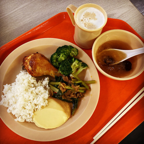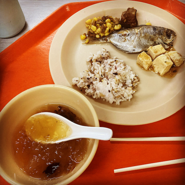 茶碗蒸し、ブロッコリー、豚肉と青菜の炒め物。あと豚足もあったけど、それはもらわなかった。デザートは白キクラゲのスープ!