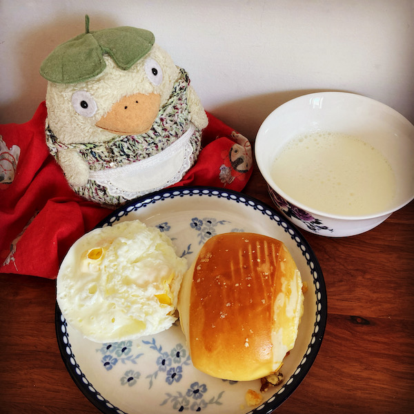今日はお昼をガッツリ食べる予定なので、朝はパン一個とレンチンたまごと飲むヨーグルト。